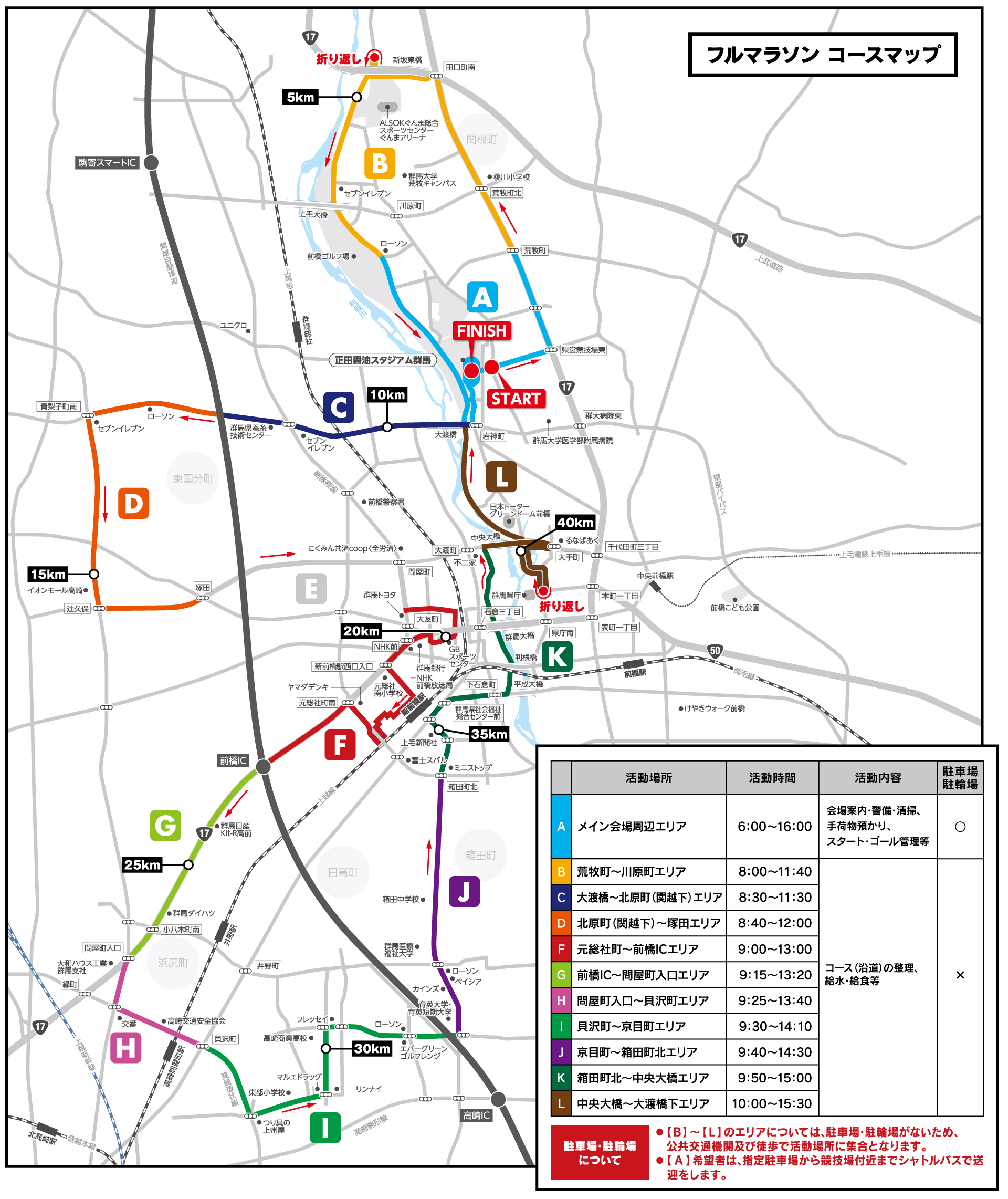 - 「ボランティア活動エリア」内の【B】〜【L】のエリアについては、駐車場・駐輪場がないため、公共交通機関及び徒歩で活動場所に集合となります。